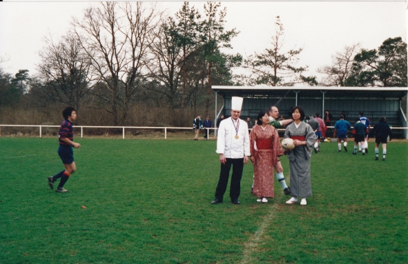 A peine une semaine après le retour d'Ecosse, une nouvelle tournée débutait (quelle année 2000!). Cette fois-ci c'est nous qui recevions : le Musashi Rugby Team, équipe universitaire, championne du Japon (oui oui...). Cette tournée organisée par notre ami Taï restera un grand moment pour ceux qui l'ont vécu. Alors pas par le résultat. Universitaire veur dire jeune...Grognards veut dire... moins jeune.... donc le résultat était évident. D'ailleurs certains adversaires du jour sont devenus internationaux japonais. Mais alors quel week-end ! Dès le vendredi soir où nosu les avons accompagné sur les stands des Journées Gourmandes de Fontainebleau. Ils ont d'ailleurs acheté tout le stand de Cognac... Et puis surtout cette réception d'après match où nous avons vu leur entraîneur (champion du Japon je rappelle) avec le chapeau des grognards à cheval sur une baguette... Décidément les Grognards c'était quelque chose...